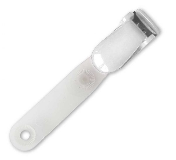 De Bretelclip Badgehouder Frosted wit heeft een kunststof bevestigingsstrip met bretelclip