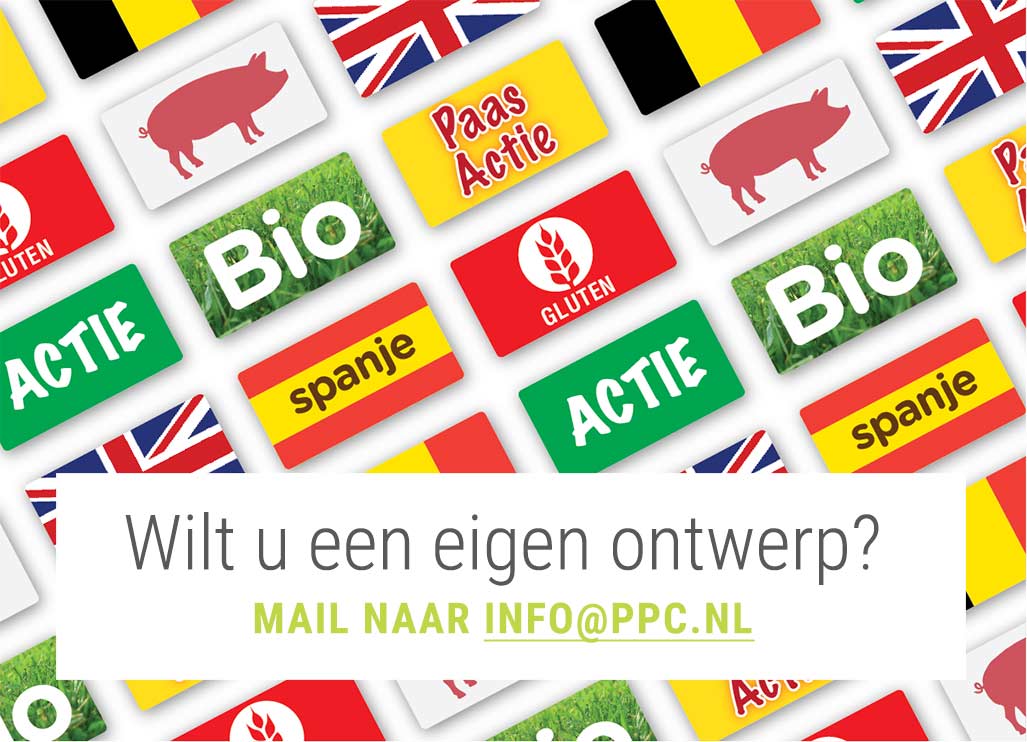 U kunt ook uw eigen prijskaart ruiters laten maken! Hiermee is het mogelijk uw eigen ontwerp te laten drukken met eigen teksten, kleuren, foto’s en layout. Voor meer informatie over het ontwerpen van uw eigen prijskaart ruiters klik hier.